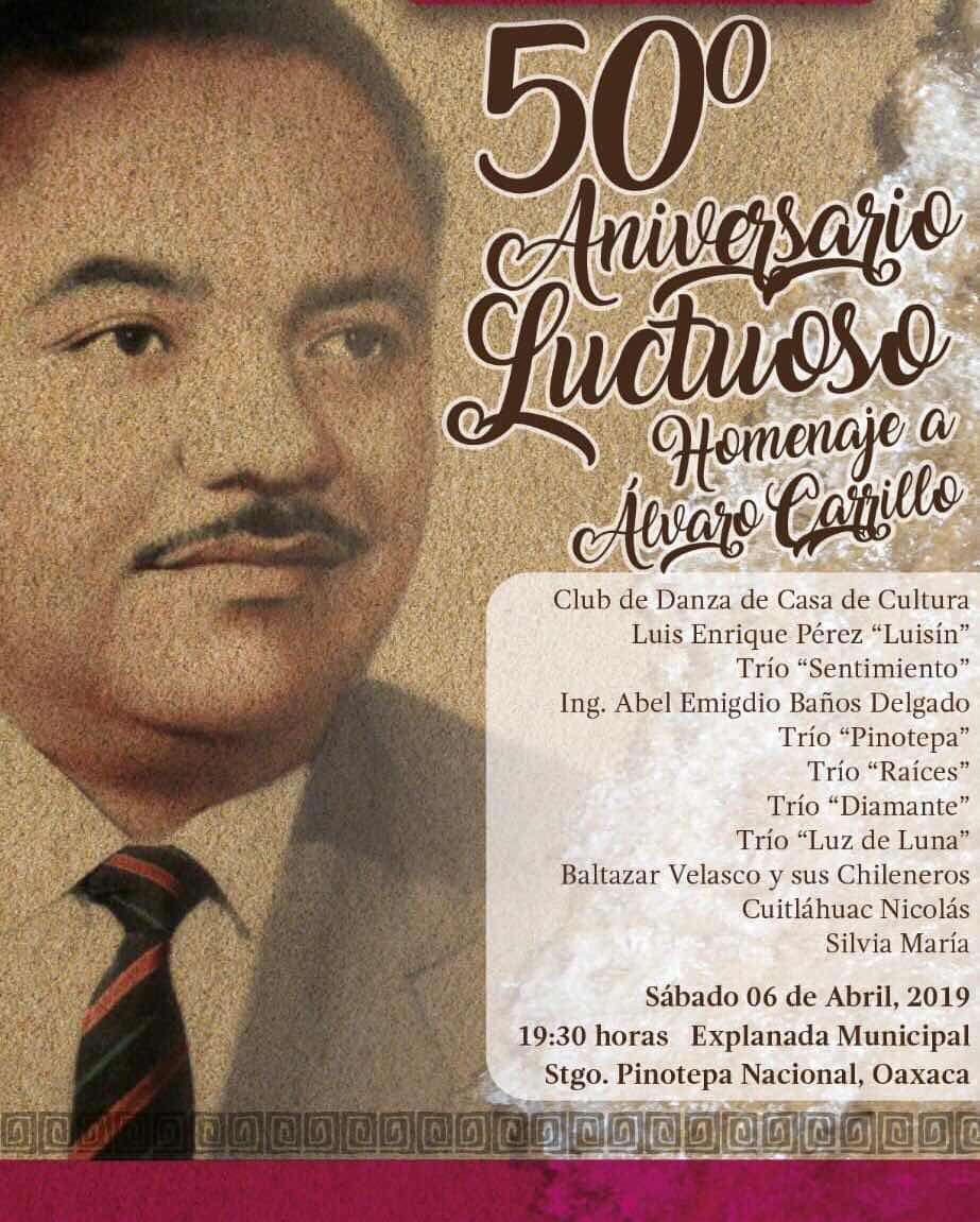 Pinotepa Nacional Oax., 04 abril 2019. (CMMI)Con una noche bohemia, se recordará al compositor Álvaro Carrillo Alarcón, a cincuenta años de su muerte, en esta ciudad de la costa de Oaxaca, donde habrá participación de una docena de artistas locales.