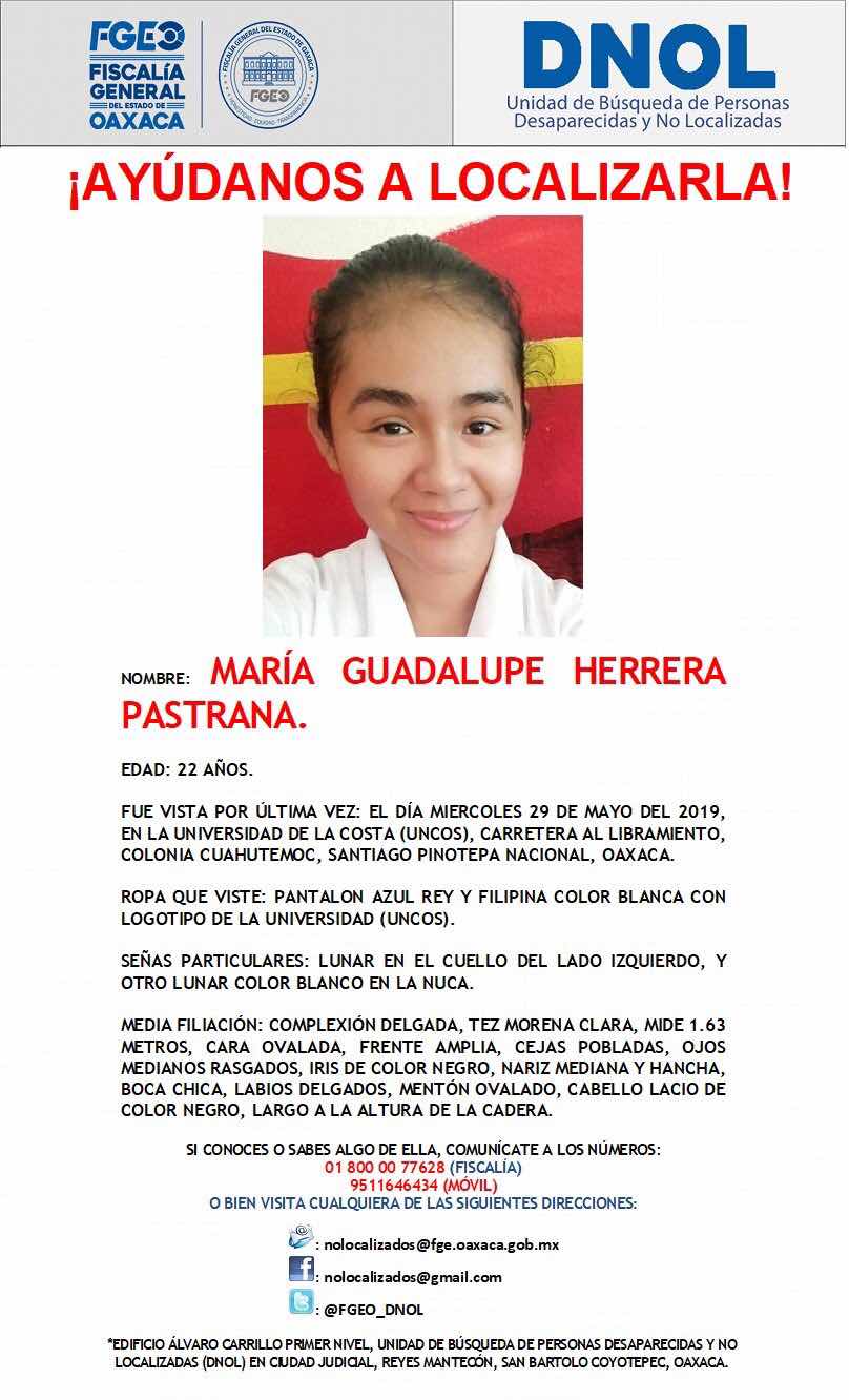 Pinotepa Nacional Oax., 31 mayo 2019. (CMMI)La joven universitaria, María Guadalupe Herrera Pastrana de 22 años de edad ha sido reportada como desaparecida por la Fiscalía General de Oaxaca, por lo que emitió una alerta de búsqueda en esta ciudad de la costa de Oaxaca.
