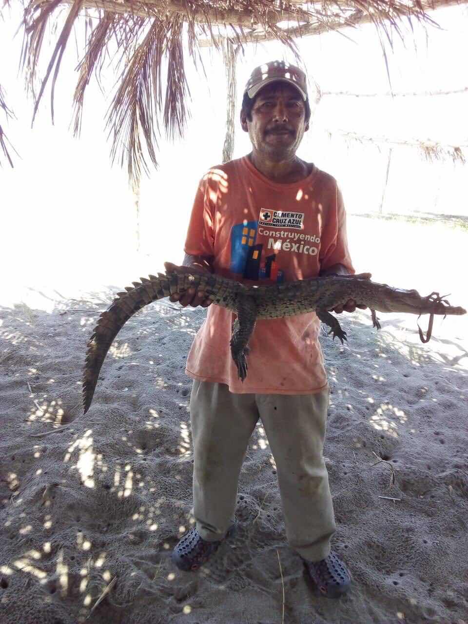 Pinotepa Nacional Oax., 13 agosto 2019. (CMMI)Durante un día de playa y descanso, un campesino atrapó a un pequeño cocodrilo en la comunidad de la Tuza del Monroy, perteneciente a Jamiltepec en la costa de Oaxaca.