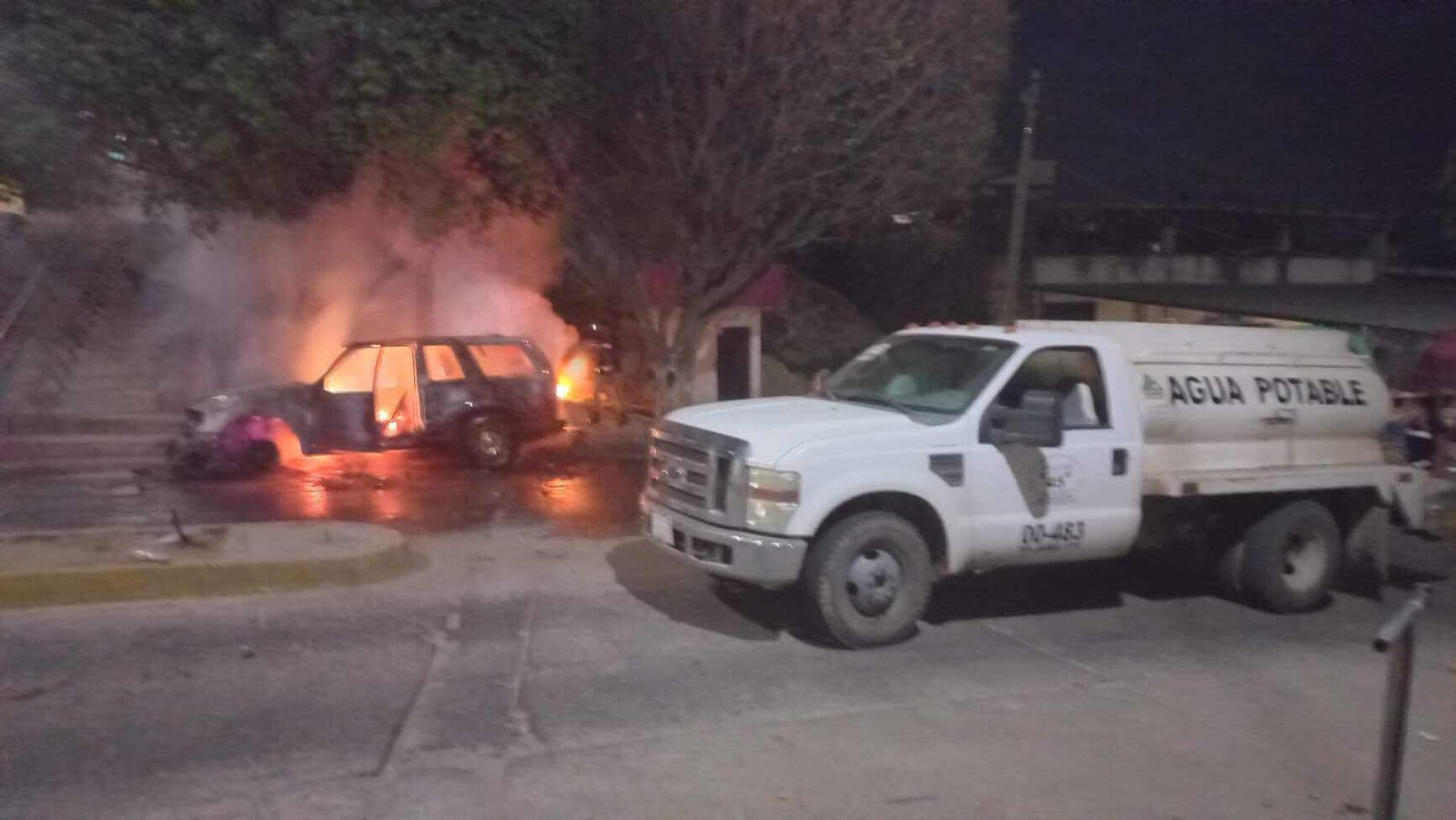 Vecinos alertaron a personal de seguridad pública y de Protección Civil Municipal de una camioneta incendiándose en inmediaciones del mercado municipal alrededor de la una de la madrugada.