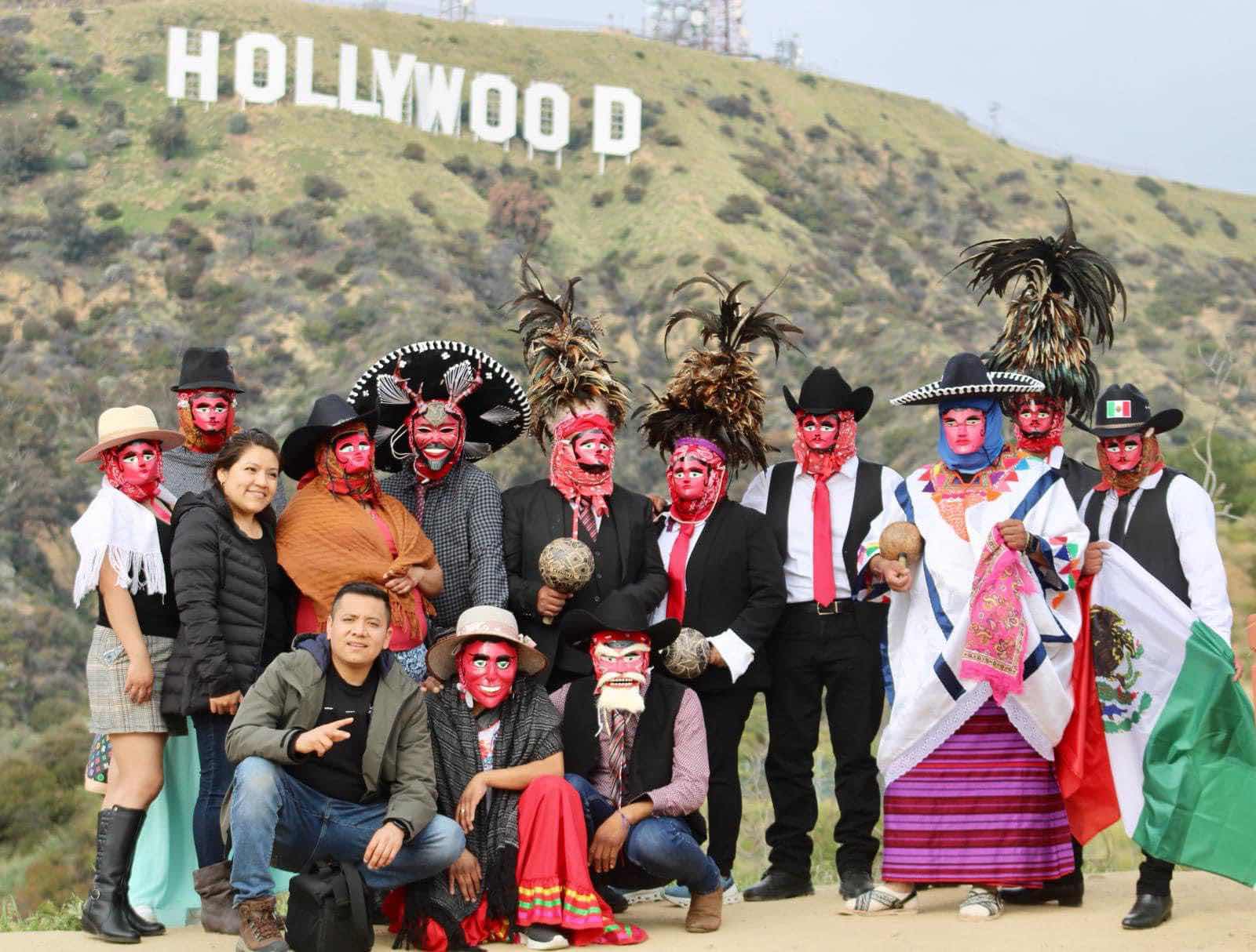 San Pedro Jicayan Oax., 22 febrero 2024.Integrantes de la danza denominada grupo Chikua’a originarios de la población de San Pedro Jicayán en la costa de Oaxaca, posaron en uno de los lugares más sobresalientes de Estados Unidos en Hollywood Sing.