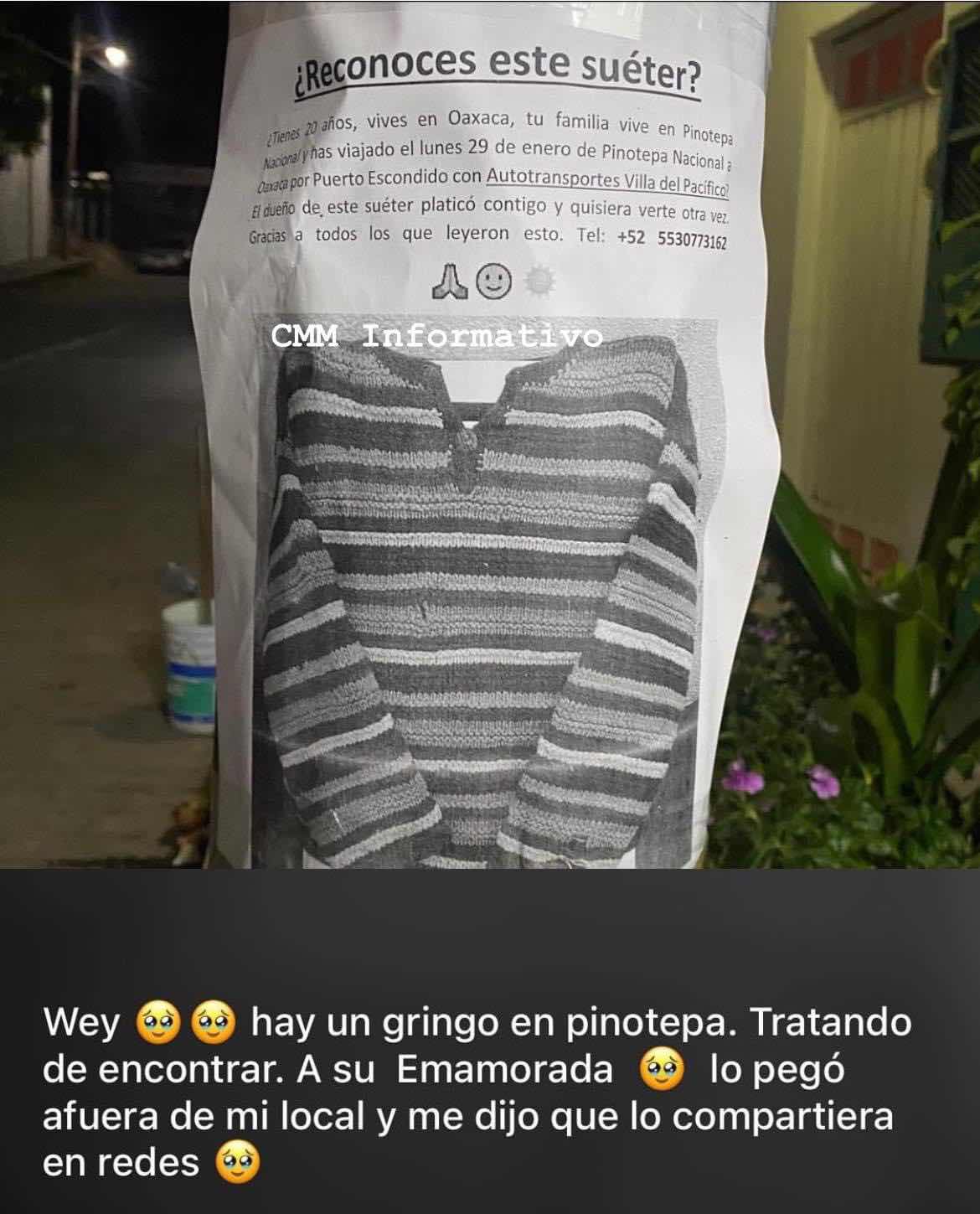 En la hoja se puede leer Conoces este suéter? Tienes 20 años, vives en Oaxaca, tu familia vive en Pinotepa Nacional y has viajado el lunes 29 de enero de Pinotepa Nacional a Oaxaca por Puerto Escondido con autotransportes Villas del Pacífico? El dueño de este suéter platico contigo y quisiera verte otras vez. Gracias a todos los que leyeron esto. Tel 55 30773162.