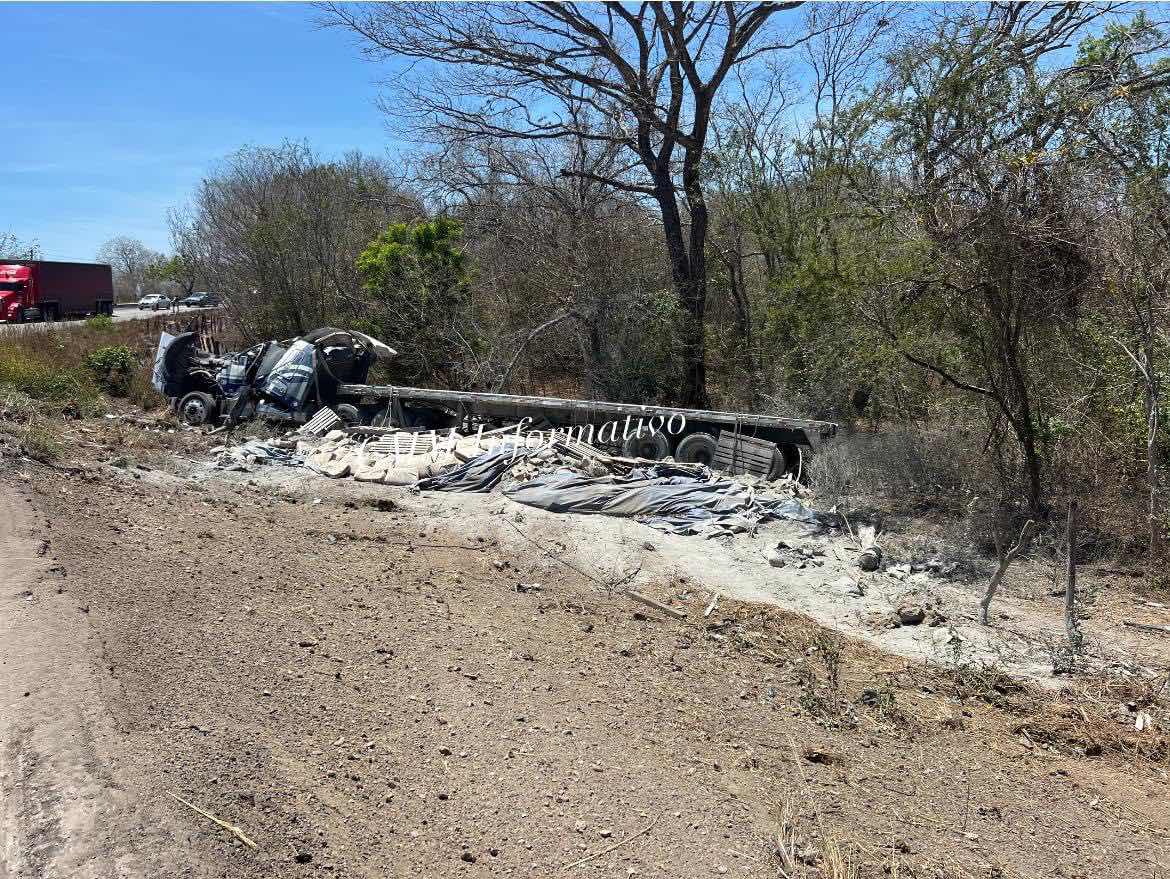 Pinotepa Nacional Oax., 26 marzo 2024.Un tráiler cargado de cemento se volcó hace unos minutos sobre la carretera federal 200 Pinotepa Acapulco en el kilómetro 242 a la altura de El Ranchito en el municipio de Pinotepa Nacional Oaxaca