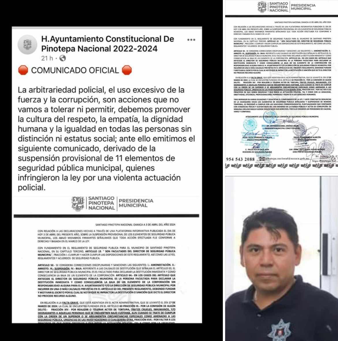 Pinotepa Nacional Oax., 04 abril 2024.El ayuntamiento confirmó mediante un comunicado la suspensión provisional de once elementos de la policía municipal de PInotepa Nacional Oaxaca