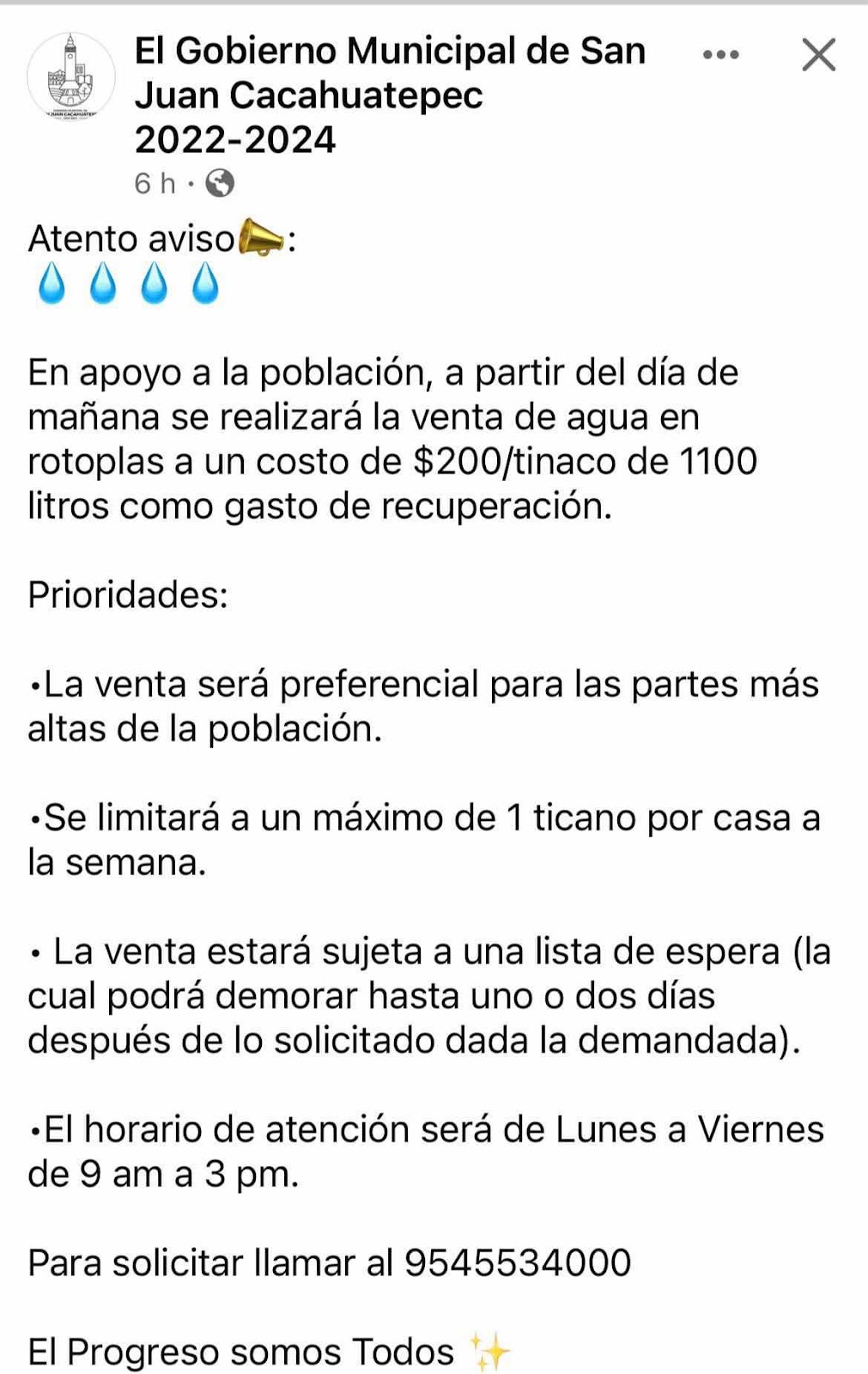 En apoyo a la población, a partir del día de mañana se realizará la venta de agua en rotoplas a un costo de $200/tinaco de 1100 litros como gasto de recuperación.