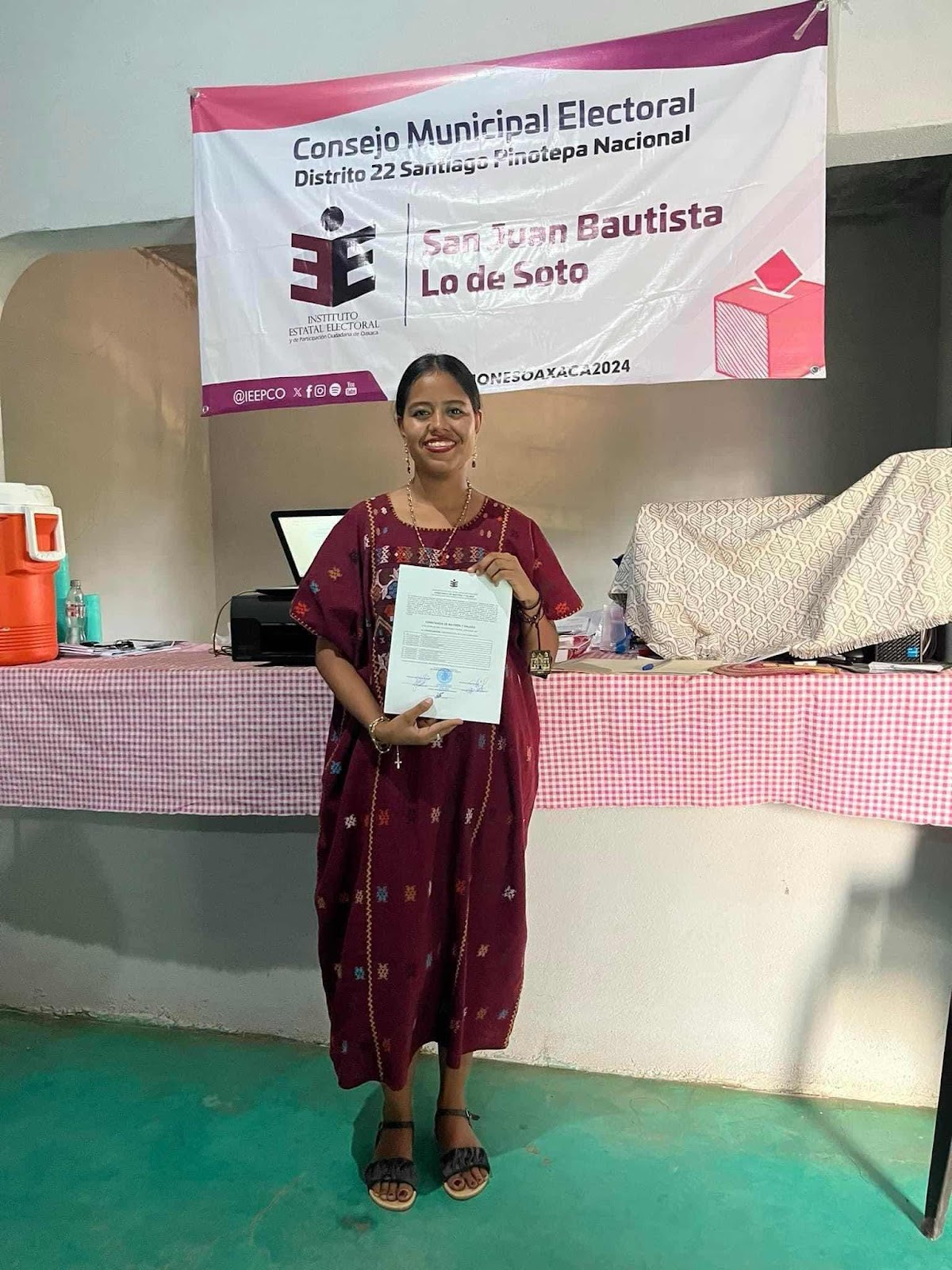 Lo de Soto Oax., 11 junio 2024. Irasema Leyva Ojeda será la presidenta municipal más joven que gobernará a partir del 01 de enero 2025 el municipio afromexicano de San Juan Bautista lo de Soto en la costa de Oaxaca.