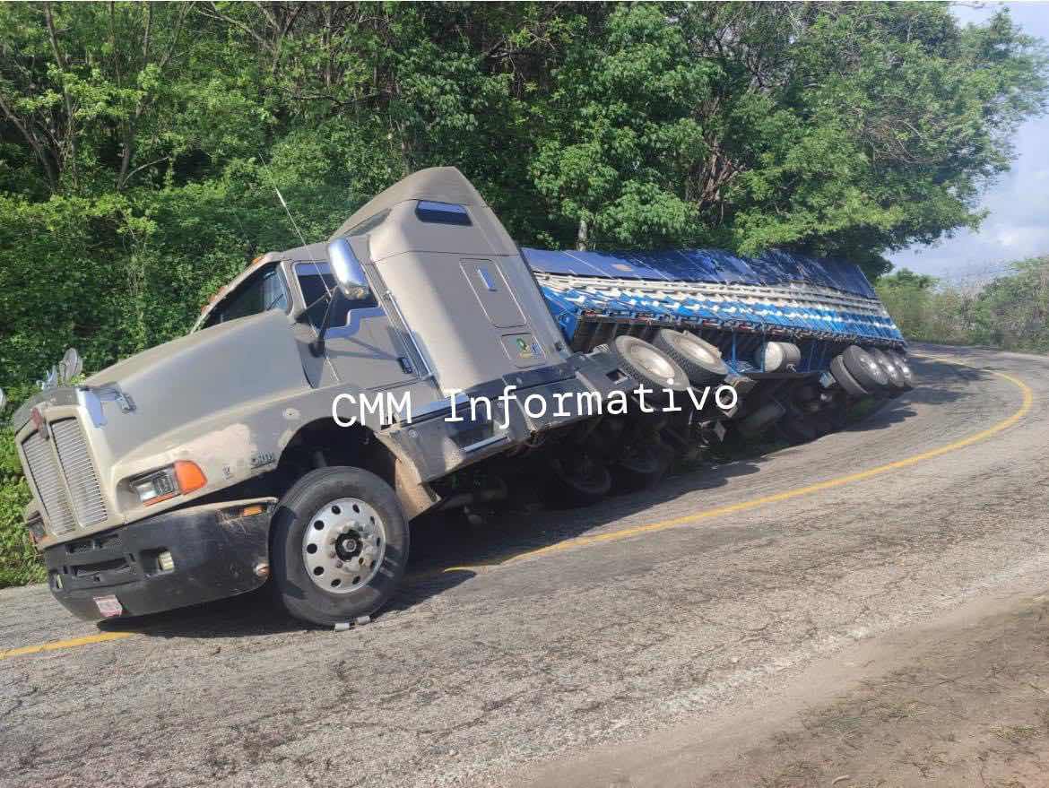Pinotepa Nacional Oax., 21 agosto 2024. Un tráiler 🚛 se acostó hace unos minutos sobre la carretera federal 200 Pinotepa Acapulco a la altura de las curvas sinuosas en la jurisdicción de Pinotepa Nacional Oaxaca