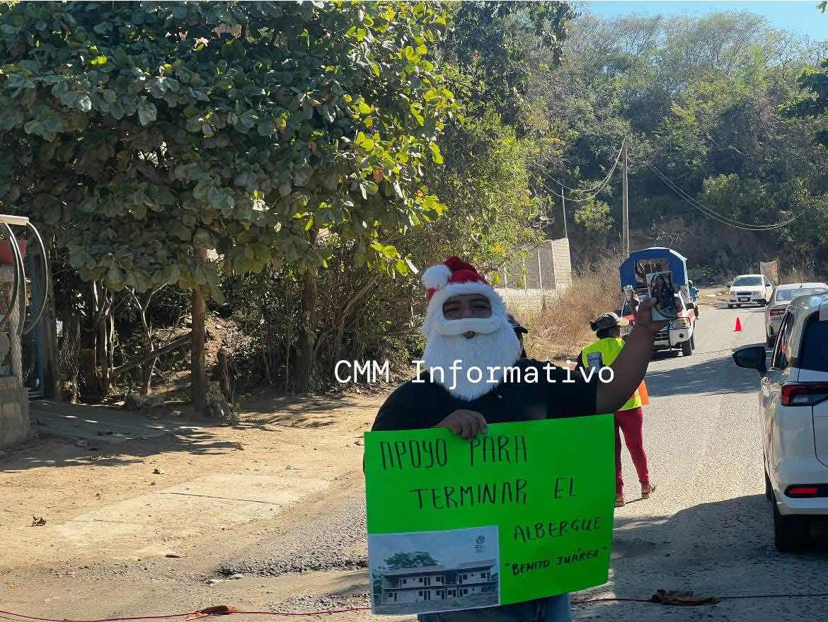 Pinotepa Nacional Oax., 26 diciembre 2024. Vestidos en alusión a la Navidad 🎅🏽 integrantes de Antocha Campesina realizan un boteo para la conclusión de un albergue en Pinotepa Nacional Oaxaca